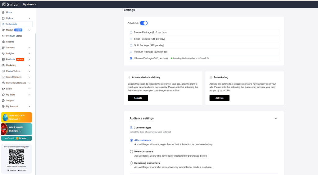 Sellvia’s built-in ad system eliminates this bottleneck. The customer sets a starting daily budget, activates the system, and the platform handles targeting, creative assets, and optimization. Many customers see their first orders on the same day they activate ads. During the 14-day free trial, a $40 advertising coupon is included – enough to run the system for 4 days at the starting budget before spending a dollar of personal money.