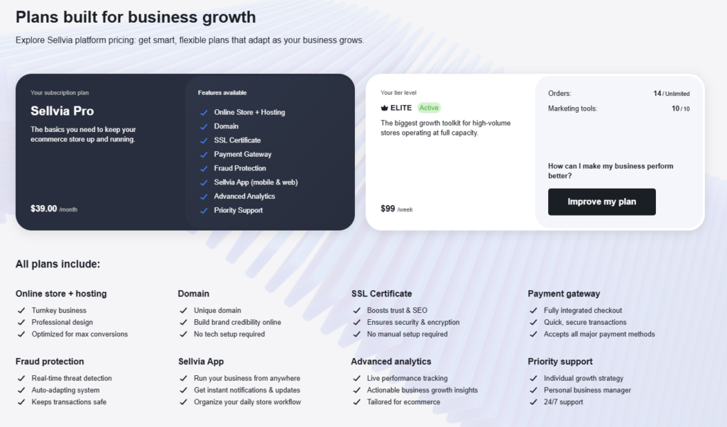 For store owners who want a more differentiated setup from day one, Sellvia offers one-time upgrade packages. These are completely optional and the standard $39/month store is fully functional without them: