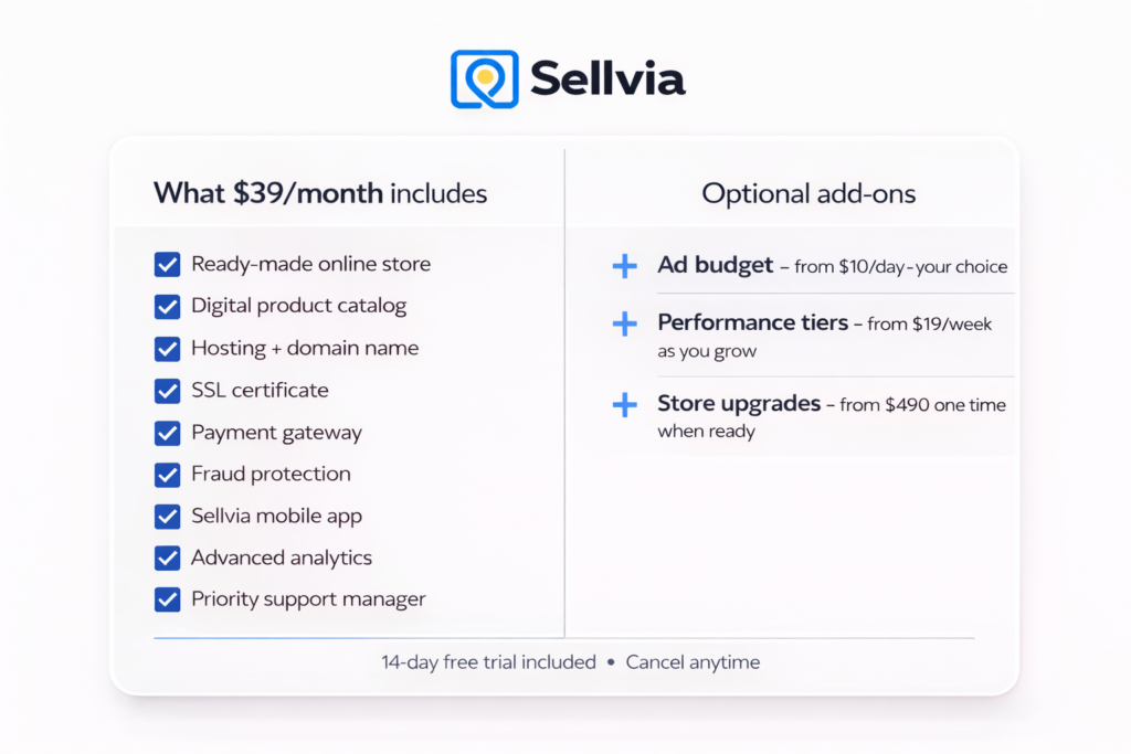 Most platform reviews bury the pricing details or mention only the headline number. We did the opposite – we went through Sellvia’s full Terms of Use to map every layer of the cost structure. The conclusion is straightforward: $39/month is not a teaser price. It is the complete, functional package. Everything else is optional.