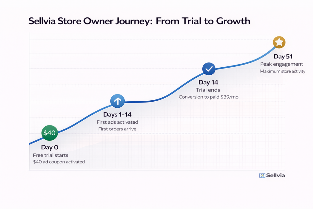 The most strategically important insight from Sellvia’s customer data is the primacy of what the platform calls the activation moment: the first time a new store owner launches ads and sees real orders come in.